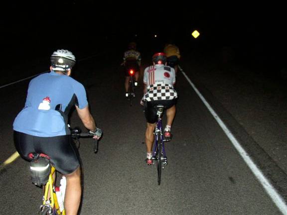 bikes, piercing the dark road in front of us. Hardly any traffic, everybody is