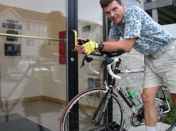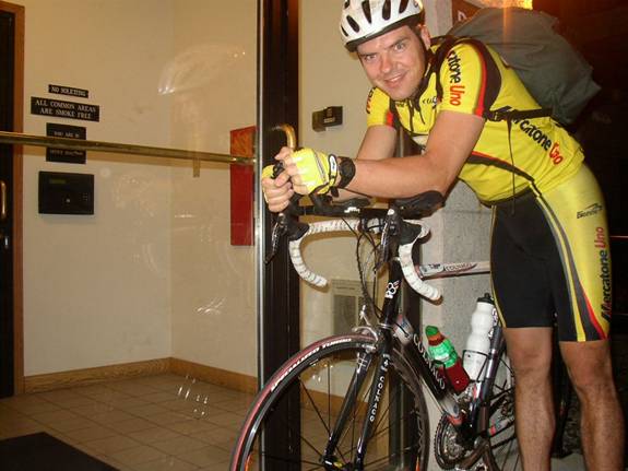 coming into the elevator with the bike tilted up and the sweat of 400km on my
