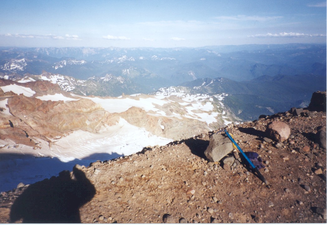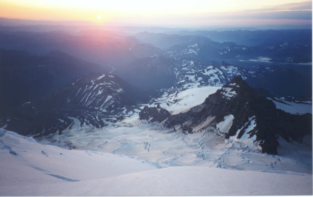 Nur zwei andere Bergsteiger haben es bis hierher geschafft, vielleicht eine Handvoll werden noch kommen. Die allermeisten der 30-40 Karavanen-Teilnehmer haben jedoch umgedreht, es ist einfach zu anstrengend für die meisten. Ich schaue zum Mt. Adams, Mt. St. Helens und Mt. Hood hinüber, wo ich letzte Woche oben war. Einige Photos, dann wird es zu kalt und ich starte wieder hinab. Die große Höhe (4400m), die Kälte, der Wind, der Schlafmangel und die 3000+ Höhenmeter Anstieg der letzten 16h machen mir sehr zu schaffen. Ich bin so erschöpft, daß ich selbst beim Abstieg alle 100m oder so stehen bleibe und auf den Pickel gebeugt keuche. Jetzt heißt es aufpassen, da ein Sturz böse Folgen haben könnte, ohne Seil mit teilweise sehr großen Spalten ist das hier schon ein ernste Angelegenheit.
