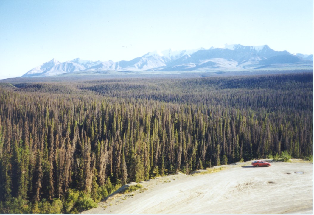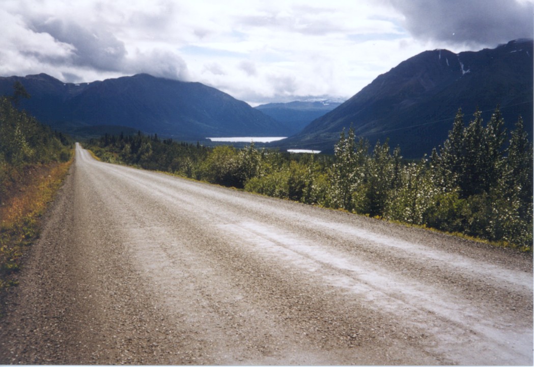 Wieder auf dem Boden der Tatsachen (bzw. des Alcan) angelangt geht es weiter Richtung Alaska. Bei immerhin zum Autofahren noch recht brauchbarem Wetter erreiche ich dann die Grenze Yukon – Alaska, die durch den 161.ten Meridian markiert wird. Laut Reiseführer eine 750 Meilen lange, perfekte gerade Schneise durch den Wald als Grenzmarkierung. USA und Kanada haben die längste ungesicherte Grenze der Welt und eine ca. 150 Jahre währende friedliche gemeinsame Geschichte. Man merkt den Unterschied zwischen Kanada und Alaska nicht an der Landschaft, sondern vielleicht an so Dingen wie Benzinpreis (USA = 2/3 von Kanada) oder Miles vs. km. Auf einmal ist der maximum speed nicht mehr 100, sondern nur noch 55…