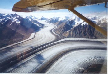 Am Nachmittag fahre ich weiter Richtung Westen, immer der Sonne entgegen. In der Ferne ragen sehr hohe Berge auf und ich studiere wieder wie so oft die Landkarte. Es handelt sich um den Kluane National Park mit dem Massif des Mt. Logan – Kanada’s höchstem Berg. Es heißt, dies sei das größte Bergmassif der Welt bezogen auf den Höhenunterschied zu den umliegenden Ebenen. Die Gletscherriesen rund um den Mt. Logan ragen fast 6000m direkt vom Pazifik auf. Die Berge sind so hoch und so unzugänglich, dazu gibt es in den Alpen keinen Vergleich. Ein Ring von ca. 3500m hohen Gletscherbergen a la Alpenhauptkamm riegelt die inneren Berge ab. Die höchsten Gipfel kann man nicht vom Highway aus sehen; dazu muß man entweder einen der "Vorberge" oder ein Flugzeug besteigen. Der eigentliche Kluane National Park ist etwa kreisförmig mit ca. 150km Durchmesser. Im Inneren riesige Gletscher und 5 Gipfel über 5000m, Mt. Logan sogar fast 6000m. Diesen zu besteigen hat den Charakter einer Himalaya-Expedition. Man fliegt ca. 1h zum Basislager auf dem Gletscher – oder aber 1-2 Wochen Anmarsch über unwegsame Gletscher. Die eigentliche Besteigung dauert dann je nach Wetter zwischen 2 und 4 Wochen. Voraussetzung: Extreme Winter-Camping-Ausrüstung, Ausdauer und gute Höhenanpassung. Obwohl Vati und ich in Südamerika bereits einen etwa gleich hohen Gipfel bestiegen hatten, ist das hier eine ganz andere Größenordnung. Vor allem das wochenlange Campieren in der extremen Kälte bei notorisch schlechtem Wetter ist nur etwas für die extremen.