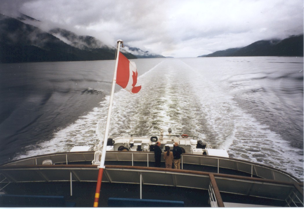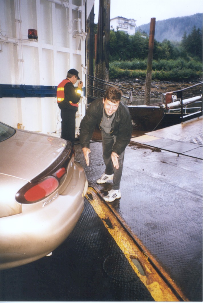 Die Dame am Telephon meinte, ich solle 2h vor der Abfahrt am Fährhafen sein. Also 5:30. Ich stelle den Wecker entspr. und bin sogleich unten bei der Fähre. Um 5:39 stehe ich am Schalter und hoffe das Beste für meine Warteliste. Die Frau am Schalter meint nur mit einer gewissen Enttäuschung: "Oh, you should have been here at 5:30!" Ich meine, es wäre doch nur einnige Minuten danach, aber diese 9 Minuten bedeuteten offenbar einen Riesenunterschied: Ab Punkt 5:30 werden nämlich die Wartelistenplätze an die Anwesenden ausgegeben. Ich war zwar an der 2.ten Position auf ihrer Liste, bekam aber nurmehr die 11.te Position hinter allen anderen! Woher sollte ich das wissen; dann wäre ich natürlich rechtzeitig dagewesen… Etwas entmutigt reihe ich mich ganz hinten ein und sehe zu, wie vielleicht 100 Autos und RVs auf die Fähre rollen. Was habe ich zu verlieren? Schon sehe ich mich wieder mehr als 1000km Autofahren, bei dem Regen! Anstatt auf der Fähre 16h lang die Beine hochzulegen und gemütlich die Fjorde vorbeiziehen zu sehen und endlich 1 Tag lang ohne Autofahren!Noch werden weitere Autos angenommen. Ich höre die Anweisungen über Funk von Bord. Für einige Wartelistenränge ist also noch Platz. Dann heißt es: "What is the smallest vehicle that you’ve got?" Zu meinem Glück sind die beiden Positionen vor mir von einem 10m Riesen-RV sowie einem Pickup-Truck belegt. Zu groß, keine Chance. Also gibt die Frau am Parkplatz meinen Ford Taurus durch – nicht gerade the smallest vehicle. Ich denke, hätte ich doch bloß einen Kleinwagen, das könnte jetzt entscheidend sein. Bange Sekunden vergehen und ich weiß, die Einschätzung des Menschen auf der Fähre entscheidet jetzt über go oder no-go. Schließlich meint er: "Ok, send’em over, we’ll give it a try!" (Bedeutet natürlich auch Can $ 300.- mehr Umsatz für sie, also im Zweifelsfall eher ja…) Mir fällt ein Stein vom Herzen und ich rolle los. Beim Einfahren muß ich einmal kurz rangieren und zirkele cm-genau in den verbleibenden Platz. Etwa 15cm hinter meiner Stossstange schließt die massive Schleuse der Fähre – knapper geht’s eigentlich nicht. Wäre vorne noch 1m mehr Platz gewesen, hätten sie wohl den Pickup-Truck vor mir genommen. Als Lehre denke ich mir: In Zukunft kommst Du genau 2h vor der Abfahrt… Ein großes Glücksgefühl kommt in mir auf, als der Pott ablegt und ich mich auf die Erholung der ganztägigen Schiffsreise freue.