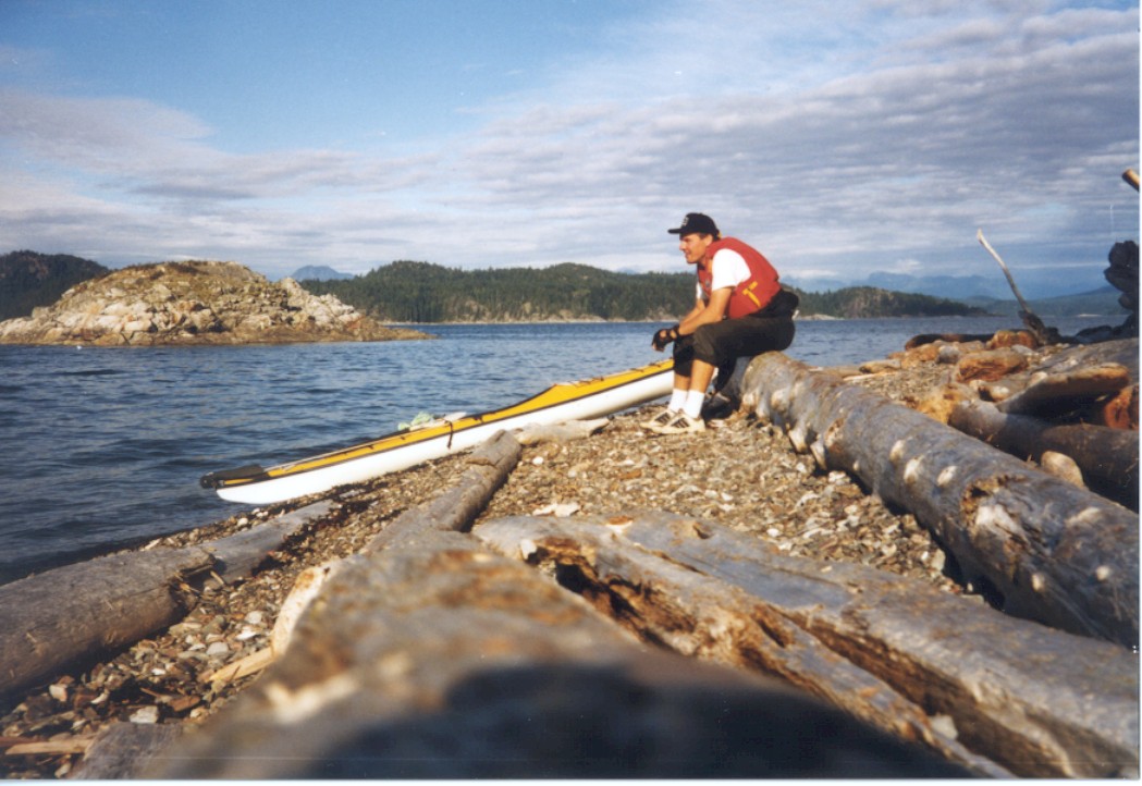 Man sieht hier viele Seeottern; sie strecken neugierig ihre Köpfe aus dem Wasser, wenn man sich nähert, zischen dann ein wenig und tauchen rasch wieder ab. Einmal habe ich bei einem großen vorgelagerten Felsen fast ein Dutzend dieser Tiere vor und rund um das Boot. Offenbar halten sich hier größere Gruppen auf und sind dabei ziemlich ungestört. Etwa zur Mitte meines Ausflugs wird es sonnig und der Ausflug wird damit viel schöner, als ich es erwartet hatte. Einmal lege ich an einer kleinen Insel an, ziehe das Boot an Land und hole einen kleinen Imbiß aus meinem im Bootsrumpf wasserdicht verstauten Tagesruckack. Auch ein Photo per Selbstauslöser muß natürlich her in dieser herrlichen Stimmung mit weichem, gelblichen Licht. Ein tolles Erlebnis. Wenn ich hier lebte, dann würde ich sicher öfter hierher in die Gegend der Strait of Georgia kommen, wie der Kanal zwischen Vancouver Island und der Küste British Columbias genannt wird.