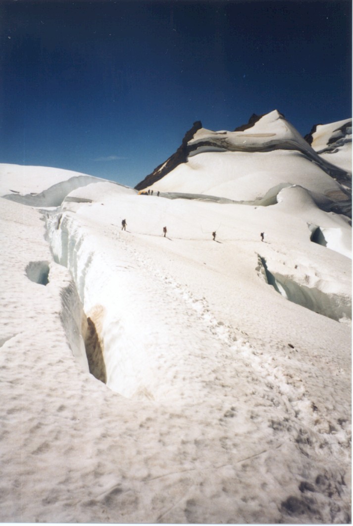 So geht es weiter über massive Gletscherhänge und nach meinem Höhenmesser in der Avocet-Uhr bin ich auf ca. 4000m. Also noch 400 Höhenmeter! Ich bin schon ziemlich erschöpft. Ich gehe immer 40 oder 50 Schritte und muß dann 10mal tief Luft holen, um weitergehen zu können! Langsam bekomme ich eine Ahnung von den Strapazen der Himalaya-Bergsteiger, die sich selbst solch Quälerei stunden- und tagelang unterziehen. Allerdings ist die Umgebung wirklich spektakulär. An die 20-30m tiefe Gletscherspalten und Seracs werden umgangen. Mit der Morgensonne sieht alles noch viel toller aus. Immer noch ein Buckel taucht auf, und weiter keuche ich nach oben.